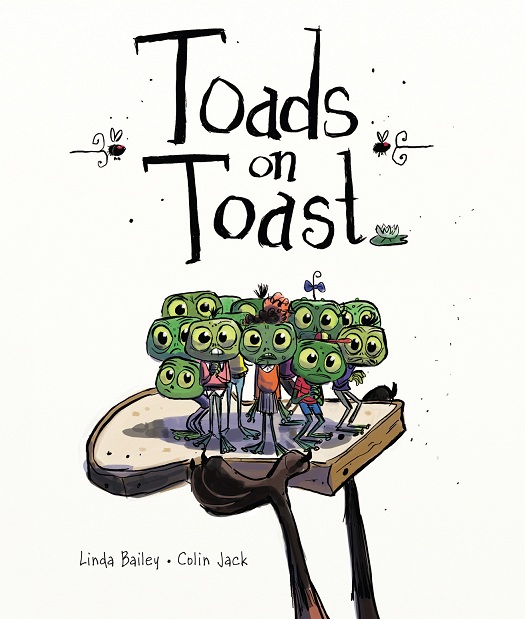 Thanks for the “wry humour.” I try to be wry! How did Toads come about? The easy answer is word play. I noticed one day that “toads” and “toast” sounded the same. But in terms of meaning, they were a bizarre combo. As it happens, I like bizarre combos, so I began to ponder how a bunch of toads might find themselves on top of a piece of toast. This led me into folktale turf in which small critters are sometimes gobbled up by larger critters, amid heart-stopping dramatic tension. I came up with characters-at-risk (young toadlets), a villain (Fox) and a heroine (Mama Toad) with enough smarts to outfox a fox. So that’s the surface answer. The deeper answer is that one of my favourite characters in all literature is Mr. Toad in Wind in the Willows. Love that guy! Wanted to do a toads story for him.